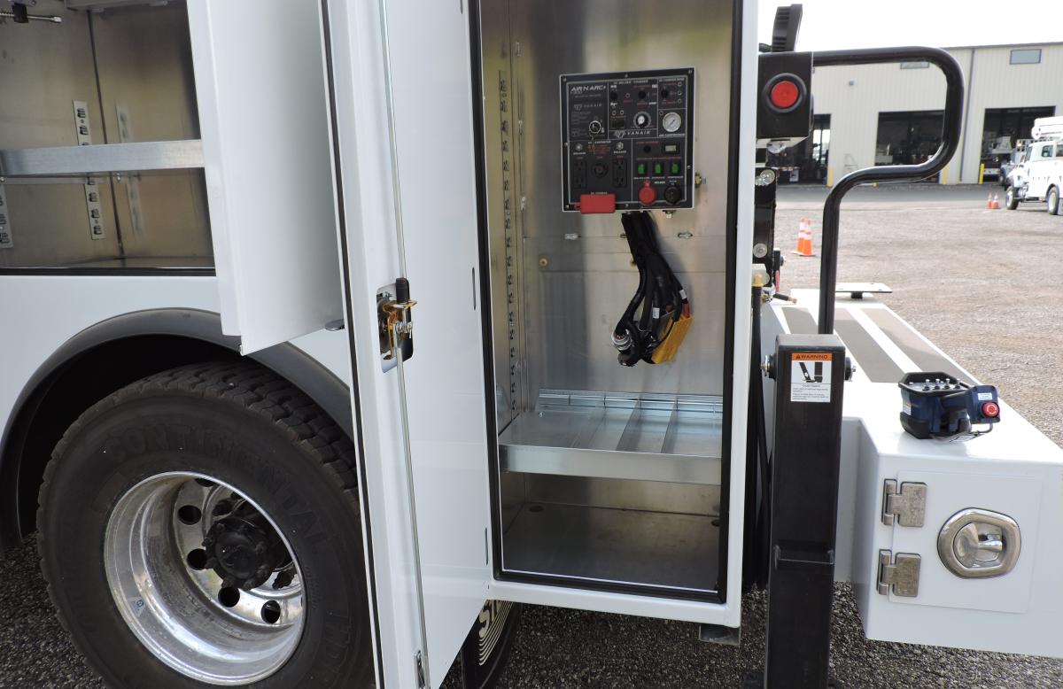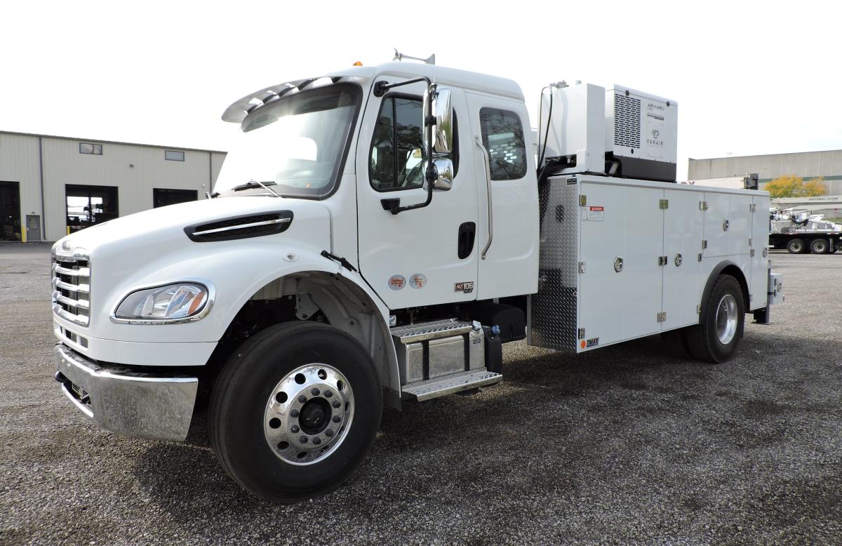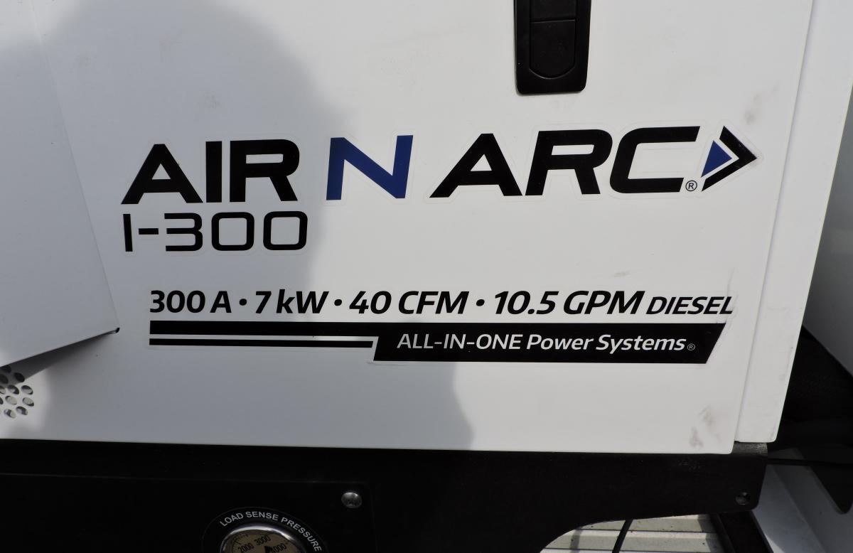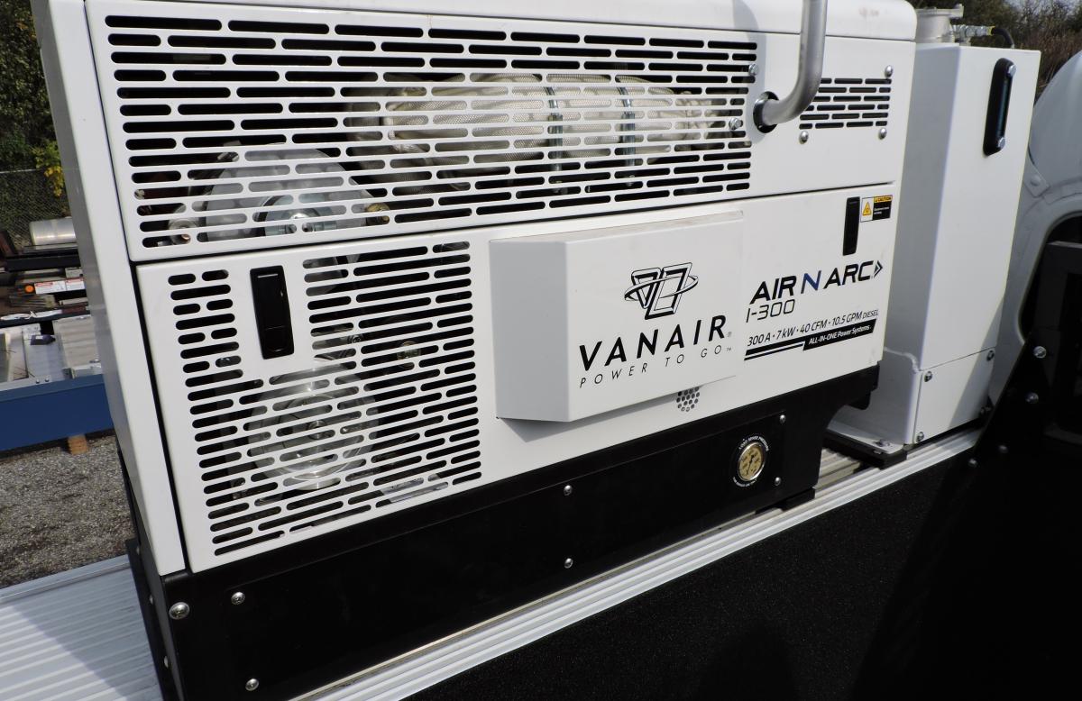 - Vanair Air-N-Arc i300 – mounted on side pack, 24.8 hp Kubota engine with 40 CFM rotary screw compressor, 6.8 kW generator, welder 300 amps peak, 260 amps @ 100% duty cycle, battery charger/booster – 300 amps 12V/24V boost, 50 amp 12V charge