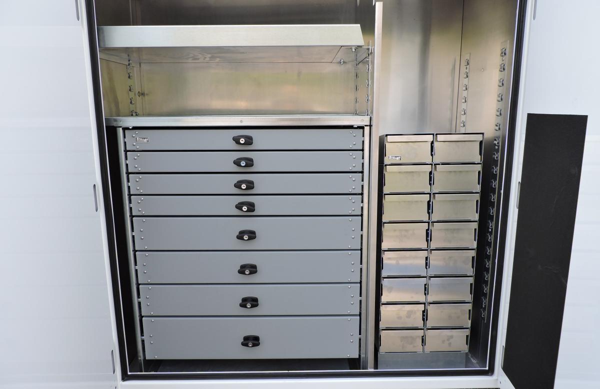 - SS1VF – Heavy duty aluminum drawer set – 36”H x 34”W x 18”D – 4-3”, 3-5”, 1-7”, One (1) shelf with (3) dividers